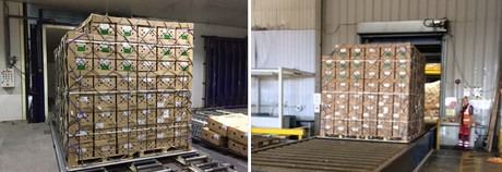 Picture on the left: IPL shipment leaving K&N. Picture on the right: Same air pallet arriving at Stanstead airport.