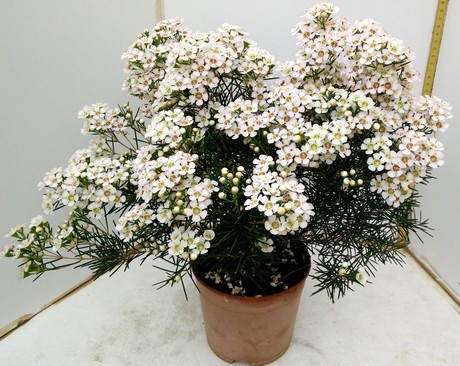 Jupiter Moon is the latest member to Nir Nursery's "Jupiter" line of wax flower. It is characterized by high volume. of terminal bloom and has big white flowers that turn a pale pink when mature. "The flowering manifestation is unique and does not occur in regular wax flower varieties that have side flowering", the breeder says. This variety, and other varieties of the "Jupiter" line, is versatile and can be used as pot plant and cut flower. (Visit Nir Nurseries to see more novelties at Suncrest Nurseries, 400 Casserly Road, Watsonville, CA 95076. Click here to email the company for more information.)
