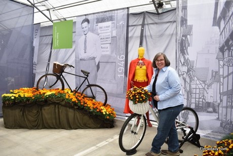 Jen Calhoun of Benary with the popular bike. With this bike, the Benary story began after World War II. In the bicycle basket, Marigold Spry. It is part of the new line of Marigold that replaces the Hero Series. This new series is now called Super Hero Series. It consists of 8 colors, they have more uniform growing habits, larger flowers, more uniform flower color and compact. Spry, the one on the picture, is an AAS Winner.