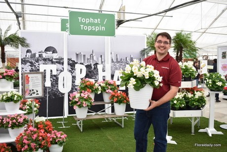 Brandon Willis of Syngenta presenting Tophat, an interspecific begonia. The series exists of a scarlet, pink and white variety and according to Willis, the size of the flower makes the white variety unique. “We are the only breeder with this large white flowers on the market. Besides that, it is early finishing and the arms do not stick out.”