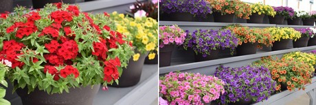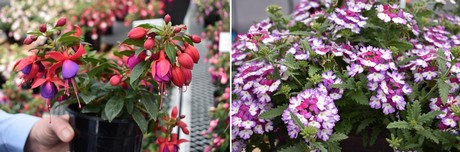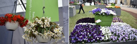On the left: Phloxstar Red is part of the new Phloxstar series that consists of three colors. It is a Phlox with a mounding habit that flowers all summer long. Many phloxstars are known for having trouble in rooting, but trials reveal that these root very well. According to Zvara it works great in quarts and 2.5 quarts. On the right: Lia is a new series of calibrachoa that is bred for baskets. The series has short internodes which means more flower power and better performance. The series currently consists of four colors and more will follow. Click here for the enlarged picture.