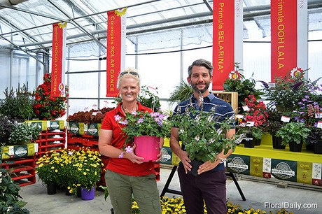April Herring of Pacific Plug and Liner holding the Geranium Bloom Time. A vigorous plant with strong growing spreading habit. Pink flowers are produced continually from May through October. It is hardy to zone 5. Josh Schneider of Cultivaris is holding the Basil Herbalea Snow White. It is disease-resistant against downy mildew, it has highly aromatic foliage and tolerant of cooler growing conditions.