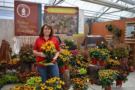Jen Miner of Pacific Plug & Liner holding the new Euchibeckia Butterscotch Biscuit, a new variety in the lineup of Pacific Plug & Liner. It has a bright buttery flower color with a light eye and is the largest flowers in the series. This variety is more aggressive in growth and is best in larger containers. The bloom time for Butterscotch Biscuit is late, similar to Yellow, so it is great for summer and fall sales and is hardy to USDA zone 7-9.