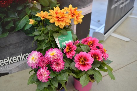 Sirekit Mol and Thomas Nass of Beekenkamp holding the new Dahlia Magiore. The Magiore is new in the LaBella series. There is only one plant in the container.