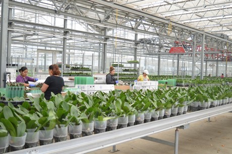 Kathy McKay of Flamingo Holland holding the new calla: Royal Dutchness, with flowers turning from yellow to pink. Next to the callas, orchids were also on display. Recently, Flamingo Holland and Floricultura Pacific announced that they will work together to develop the orchid market in North America.