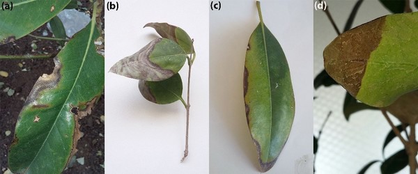 Figure 1: Leaf spot symptoms caused by Phyllosticta capitalensis on a) Magnolia grandiflora and b) Syringa reticulata. Leaf spots caused by P. capitalensis 14 days after inoculation on c) Magnolia grandiflora and d) Syringa reticulata.