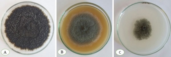 Figure 2: Phyllosticta capitalensis after 7 days on a) potato dextrose agar, b) malt extract agar and c) saltwater nutrient agar.