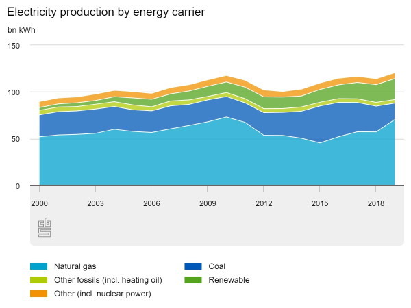 In 2019, electricity production in the Netherlands reached a record level of 121 billion kWh. This is a 6-percent increase on the previous year. The consumption of electricity remained more or less stable. There is a clear shift from coal to natural gas as a raw material for electricity generation. At the same time, imports from Germany declined. This is evident from new figures released by Statistics Netherlands (CBS).