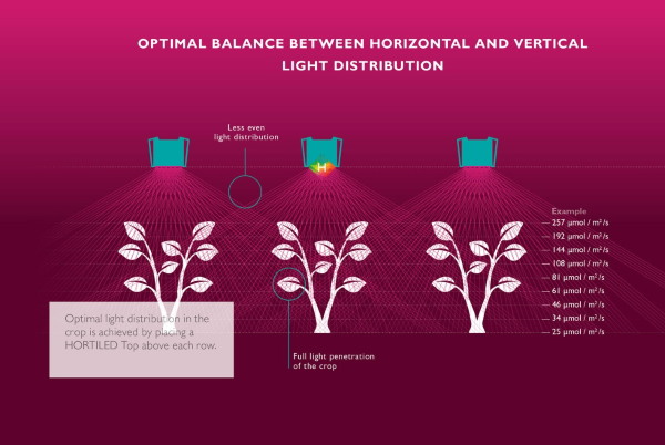 When developing the Hortiled Top fixtures, Hortilux chose to distribute the grow light over multiple LED light sources. This creates better light reception for both tall-growing crops and ornamental plants, giving you the highest yield from a micromole PAR. Choosing the right reflector is also important. Often this is one with a narrow angle; this reflector also ensures better light penetration in tall-growing crops. In combination with the Hortiled Top, you can create the ideal scenario.
