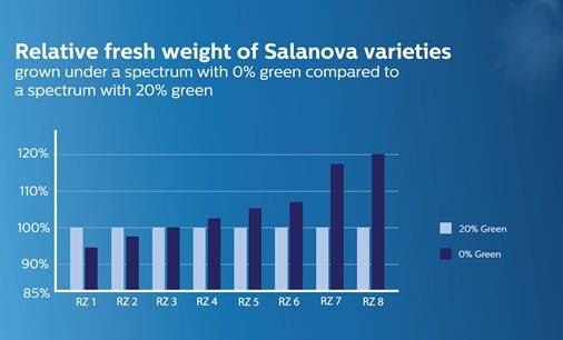 At the Philips GrowWise Center, they have run a trial where we have grown eight RijkZwaan Salanova lettuce varieties under light spectra with both 0 and 20% green light, but with the same photon flux and percentage of blue light. The graph below shows the relative fresh weight of these crops, comparing the growth under both spectra with 0% green and 20% green light.