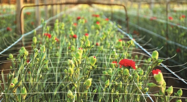Carnation crops require rigid support to stop the plants from bending.