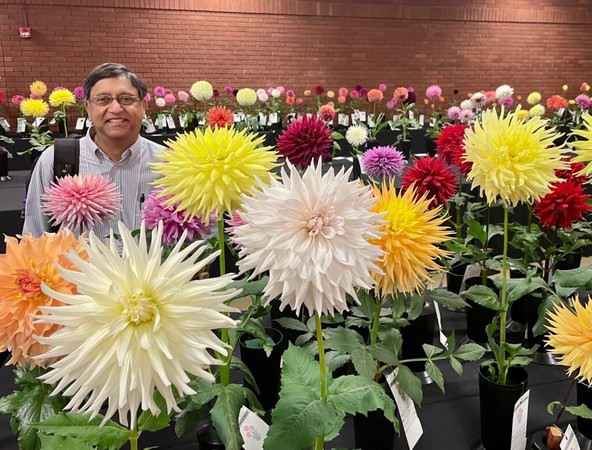 WSU virologist Hanu Pappu, taking part in a dahlia society annual meeting and show in 2021.