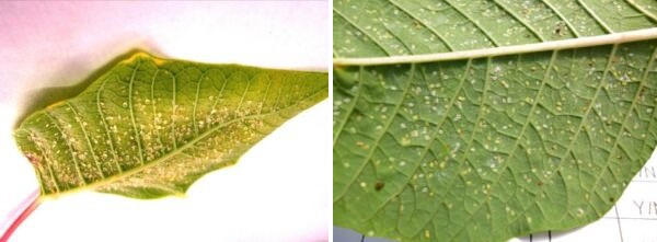 An extreme population of whitefly nymphs & adults has produced an extraordinary amount of honeydew dripping from beneath this poinsettia leaf. With time, leaf will turn black from sooty mold fungus. (Photo Credit: Steven K. Rettke, Rutgers Coop. Ext.)