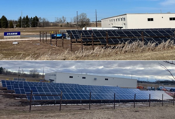 The Dramm Corporation completed the installation of 286 solar panels at the new headquarters in Manitowoc, Wisconsin. The 18,000 sq. ft. ground-mount solar panels produce an annual energy savings of 161,990 kilowatts.