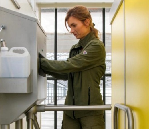 To better counter the spread of diseases and pests, a modern hygiene entrance has therefore been fitted in the new greenhouse with individual changing rooms and work clothes that must not leave the greenhouse. Moreover, the hygiene entrance is also equipped with a new sanitation station where hands and shoes are thoroughly disinfected before entering the greenhouse.