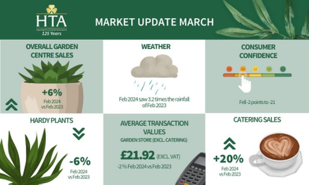 Despite facing a deluge of rain across the United Kingdom, the Horticultural Trade Association's (HTA) Market Update in March 2024 reports that garden centers in February 2024 remained positive, with a +6% increase in overall garden center sales compared to the same period last year.