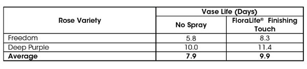 The average vase life of both varieties without treatment was 7.9 days, while the average vase life of the roses treated with FloraLife® Finishing Touch spray was 9.9 days. Both rose varieties reached at least 8 or more days of vase life with the FloraLife® Finishing Touch Spray applied. The treated roses also resulted in brighter red 'Freedom' roses.