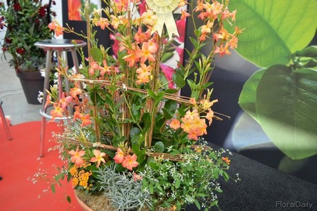 Diamantina Opale Orange Coral of DHM Innovation used in a combination. This dipladenia won the Best Innovation award 2016 at the IPM Essen. Orange Coral features a new color. It is slightly smaller than standard dipladenia types, the flowers are colored in shades of orange. Plant habit is comparable to the other Diamantina varieties belonging to the Opale series.