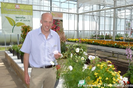 Andrew Spencer of Thompson and Morgan next to the Cosmos Cupcakes at the Flower Trials in the Netherlands.