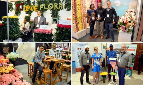 Clockwise from upper left: Santosh Kulkarni, general manager of PJ Dave Flora; Jackson Wawena and James Cook, together with Lucy Kangeli visiting the booth of scented roses specialist Tambuzi Farms; Pardeep Sing, Riane van Hattum, Joseph Mbugua and Karel van Hattum of Jamafa Machinery; and Arfhan Mughal and Girish Appana from Black Tulip and Fontana Group resp.
