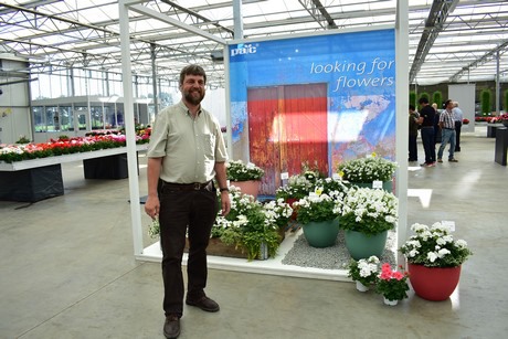 Dr. Martin Geibel of PAC Elsner, he is the breeder of the pelargoniums. The Pelargonium TwoinOne White, a new variety, is presented in this display.