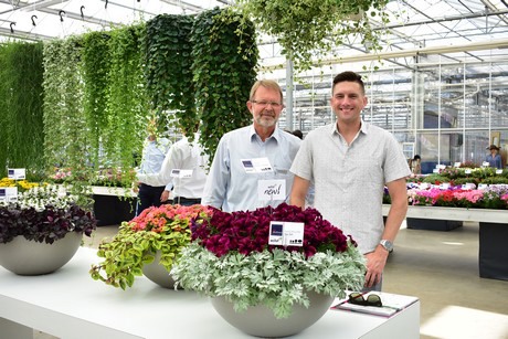 Manfred Mehring-Lemper of Westhoff and Chris Berg, representative of Elsner PAC and Westhoff in North America presenting the Petunia Crazytunia Cosmic Purple (on top of the mix on the right) and Calibrachoa Chameleon Atomic Orange (on top of the mix on the left).
