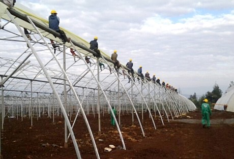 The plastic Hanuel greenhouse is being manufactured by Agrigreen. "The speed of assembling the greenhouses is faster than normal," says Raphael Mulinge General Manager Winchester Farm.