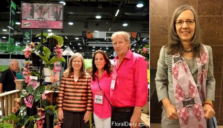 Anna Ball of Ball Horticulture with Carrie Oorsprong and Ted Oorsprong at the Cultivate '15. On the right picture: Anna Ball with her Medinilla scarf. Last year, Northend Gardens made a partnership with Ball horticulture, who are presenting them in the US as pre-finished plants; "these plants are 6 to 8 weeks away from flowering," says Oorsprong.