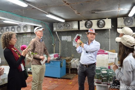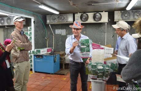 After packing the flowers, they are brought to the cooling area, where they have to be hydrated for a least four hours before they can be transported. "After four hours the head is reached and they are fully hydrated," he says. In the photo he shows the two wraps they use, one hard wrap to protect the rose petals and an outer plastic sleeve which is used to protect the foliage.