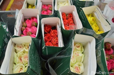 Azout explains that they put ethylene blockers inside the box. "Many perfumed and garden roses are very sensitive to ethylene. Water will activate the ethylene blockers. Then, they will release a gas which will block the ethylene absorption of the roses." Furthermore, each bunch is tagged with the name of the bunch maker. "This has two advantages, one for us as no bunch will get lost and one for the receiver as they can see that every bunch is created by a person. Funny enough, some customers think the name on the tag is the name of the variety," he laughs.