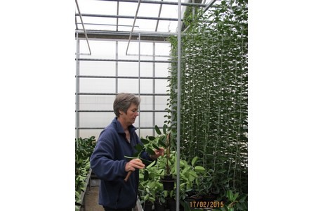 During the winter months they are growing and preparing the Stephanosis floribunda for the selling season, which is in March, April, May and two months in the autumn. "In the beginning of spring our plants need to be ready; they need to be the desired height of 2 to 2.5 meters", explains Kirsten. Then, a month prior to selling the plants, they will increase the temperature in the greenhouse, which enables the Stephanosis floribundas to develop flowers. "The Stephanosis floribundas are grown in different greenhouses allowing us to stagger the weeks in which we turn up the heat. This enables us to supply plants every week of the selling season", says Kirsten.