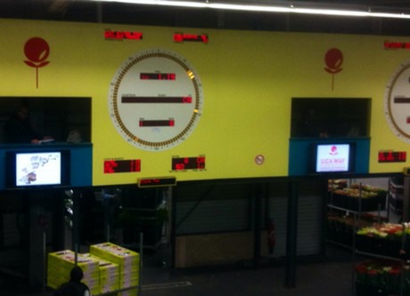This picture made by Sarah Corselis at the Hyeres Flower Market in France. The cut flower orchids of Okidland were auctioned and on the left side of the picture and roses on the right side.