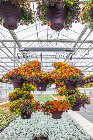 Linwell Gardens grows a large number of different plants and varieties. In almost all greenhouses, production, seeding, and shipping areas, the hanging baskets are stored in the top of the structure with the help of an automated basket system.