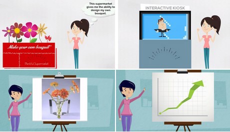 Clockwise: Customer is visiting the supermarket and sees the flower display. The interactive kiosk helps her to create a bouquet or arrangement. “Easy arrange” containers will make the bouquet look spectacular. Finally, total supermarket sales increase. Click here to view a short video that explains the concept in the context of increasing foot traffic to supermarkets.
