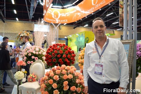 Andre Vreugdenhil of Dümmen Orange. The company is exhibiting at the show for the first time under the name Dümmen Orange. The Christa is a new introduction (in the back on the left). The color of the rose is light pink. "So far the reactions have been positive. Many like the color and the fact that the bud opens widely," says Vreugdenhil.