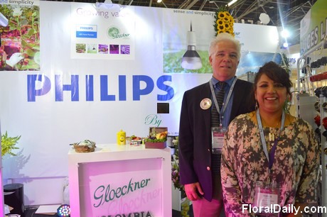 Andrew Lee and Monica Alvarez of Gloeckner. They supply summer flowers from seed and bulbs and hardware to the Colombian growers. They are also promoting the philips flowering lamp as they are hortpartners with philips. "This flowering lamp will be the next thing here in Colombia. It creates better quality plants and saves on electricity costs," says Lee.