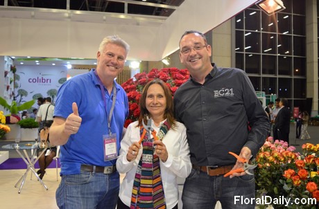 Rainer Kibbel of Original Löwe, Maria Carolina Estrada Ruiz of Flores Esmeralda and Richard Heemskerk of HSI. They are holding the pruner nr. 14 of Original Löwe. With this pruner, Original Löwee wants to enter the South American market. Heemskerk, of HSI, will distribute the pruners in South America. Ruiz of Flores Esmeralda grows roses and alstroemerias in 2 farms, 30ha and 35 ha, in Colombia.