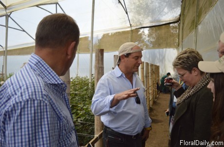 After packing the flowers, they are brought to the cooling area, where they have to be hydrated for a least four hours before they can be transported. "After four hours the head is reached and they are fully hydrated," he says. In the photo he shows the two wraps they use, one hard wrap to protect the rose petals and an outer plastic sleeve which is used to protect the foliage.