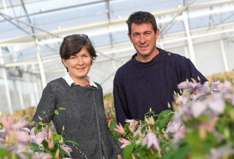 Marie Laure Rauline and Ben Rauline in one of their greenhouses full of clematis (Credit photo : depoorter)