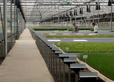 The Trinog greenhouses at Plantech have a 9.6 m bay, 5 m section and are 4.5 m high under the gutter. The top of the greenhouse is 7.2 m. The structure includes roof ventilation and inner shading systems. Trinog has also installed movable irrigation booms and their new seeding bench system, which offers a relatively simple and affordable alternative to advanced and more heavy bench systems. It is based on a Y-type rail system that provides support for EPS propagation trays.