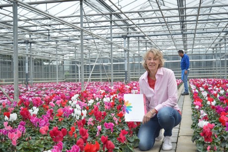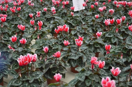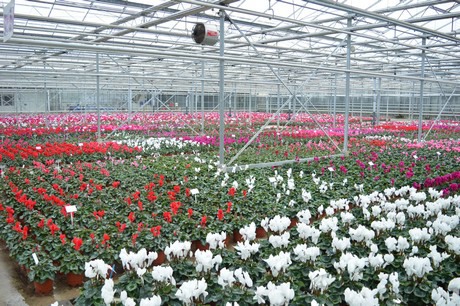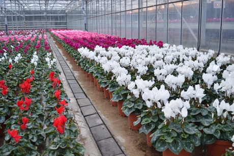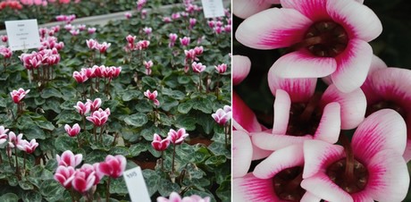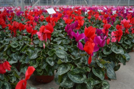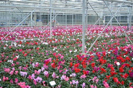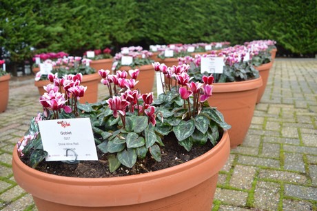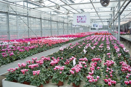 The larger varieties are grown on a concrete floor. In this picture the cyclamen mixes. These cyclamen varieties are on display both, in mixes and separately. "In the mixes, we show the uniform growing habit of the different varieties in the series."