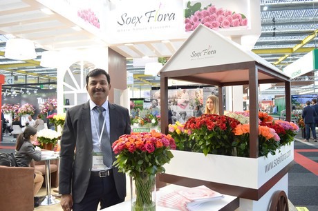 The roses of Indian rose farm Soex Flora at booth number C4.03. In the picture Narendra Patil.