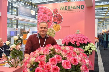 The new Valse de Meilland of French rose breeder Meilland. According to Matthias Meilland (in the picture) this bicolored rose has an excellent productivity and large head size. "Even at a 'Naivasha altitude' - at Red Lands Roses, where these roses on the picture were grown - they can produce large head sizes." The Valse de Meilland is on display at booth number A2.11.