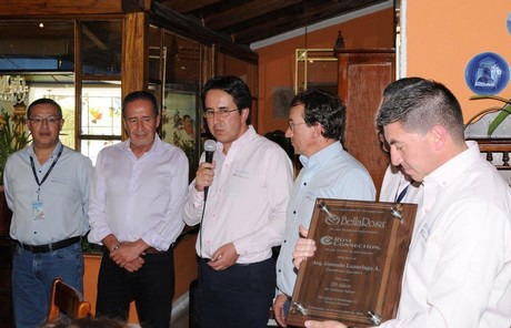 Gonzalo Luzuriaga receives a special award for 20 years leading BellaRosa, Santiago Luzuriaga and other executives of the company give the prize.