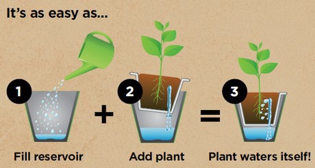 Waterwick is a system that provides plants with just the right amount of water by using the blue-and-white cord that extends into a water reservoir. It can be applied automatically before or during cultivation and keeps plants perky through transportation and in retail displays. All you have to do is keep the reservoir filled with water so the system doesn't run out.