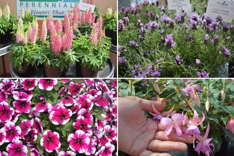 Clockwise: Lupine Staircase was introduced in 2016. They are cold hardy to zone 4 and have a good bud count and are day length responsive. The Madrid Lavish Purple has a unique flower as it is said to be the first ever double lavender. Good and Plenty Purple Splash petunia is a new color in the Good and Plenty series. The petunias in the Good and Plenty series have a mounding and spreading habit and flowers that cover the entire plant. Windchimes Pink Lilac Fuchsia is a new addition to the Windchimes series. The plan has large flowers.