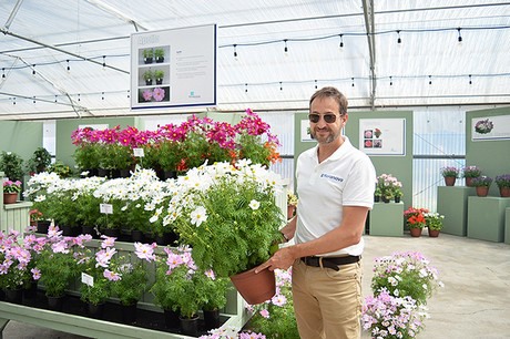 Eyal Inbar of Hishtil presenting the Scabiosa Kuda. Bred by a Japanese flower, it is a first year flowering perennial that produces compact mounds of foliage and stems and has large flowers. It grows up to 40-50cm (16-20") height and spread to 50-60cm (20-24"). The variety with white flowers (on the left) is new and they will come with a blue variety soon. According to Inbar, they could not fulfil the demand in Europe, where they have introduced it one year ago.
