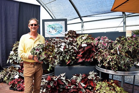 Steve Jones of Green Fuse Botanicals with the Begonia Dibs Cherry Mint. The size of the plant and the leaf is large. The plants can be put indoors and outdoors.