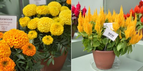 On the left: Cheerleader Marigold is a new early flowering F1 hybrid African Marigold series that consists of three varieties. It has compact and robust foliage. The large blooms are weather resistant and held above the foliage. The 3 colours are uniformly early into bloom. On the right: Also Bright Sparks is a new series. The plant has large plumes (3-4 inches tall and 3 inches wide), has a well branched habit and great heat tolerance. The extra branching results in more flowers per plant and the bloom size on the secondary flowers also matches the initial flower. According to Wilson, these blooms are also less prone to colour fading than competing varieties.