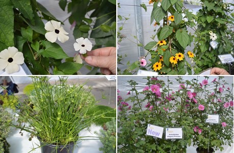 Clockwise: Thunbergia Arizona White Halo has White-ivory flowers with a dark center and green, arrow shaped foliage. The flowers are bigger than the existing Jaldety's White thunbergia. It is early flowering and hardy to US zone 9-10. Thunbergia Arizona Glow has Orange-red flowers with a dark center and dark green arrow shaped foliage. It is early flowering and hardy to US zone 9-10. Anisodonea Elegans Princess has pink flowers and green, cut leaves. It is hardy to US zone 9-11. Cyperus Prolifera is a plant that is mainly grown for its unusual textured bracts and umbels. It is a heat tolerant, easy to grow and low maintenance water plant.